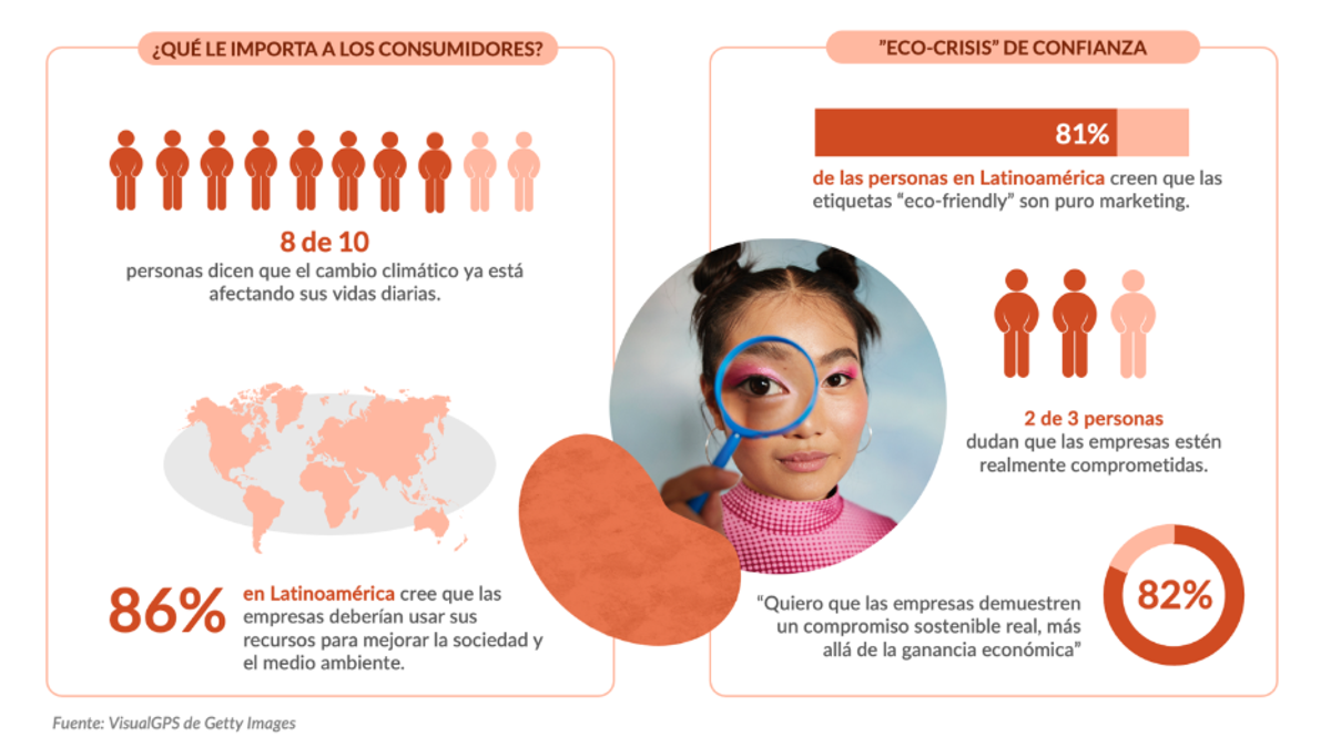 Opta por integración, no aislamiento: 75% dice que quieren ver imágenes y videos que muestren cómo las empresas y los gobiernos están abordando el cambio climático. Ahora y en el futuro, no solo a través de campañas aisladas. Muestra la sostenibilidad como un valor central de marca. Las empresas que integren la sostenibilidad de manera coherente en su identidad, a través del diseño de sus producto, comunicación y servicio al cliente, y la respalden con contenido visual honesto y claro, tienen la oportunidad de generar conexiones emocionales más profundas y una confianza duradera con los su audiencia.